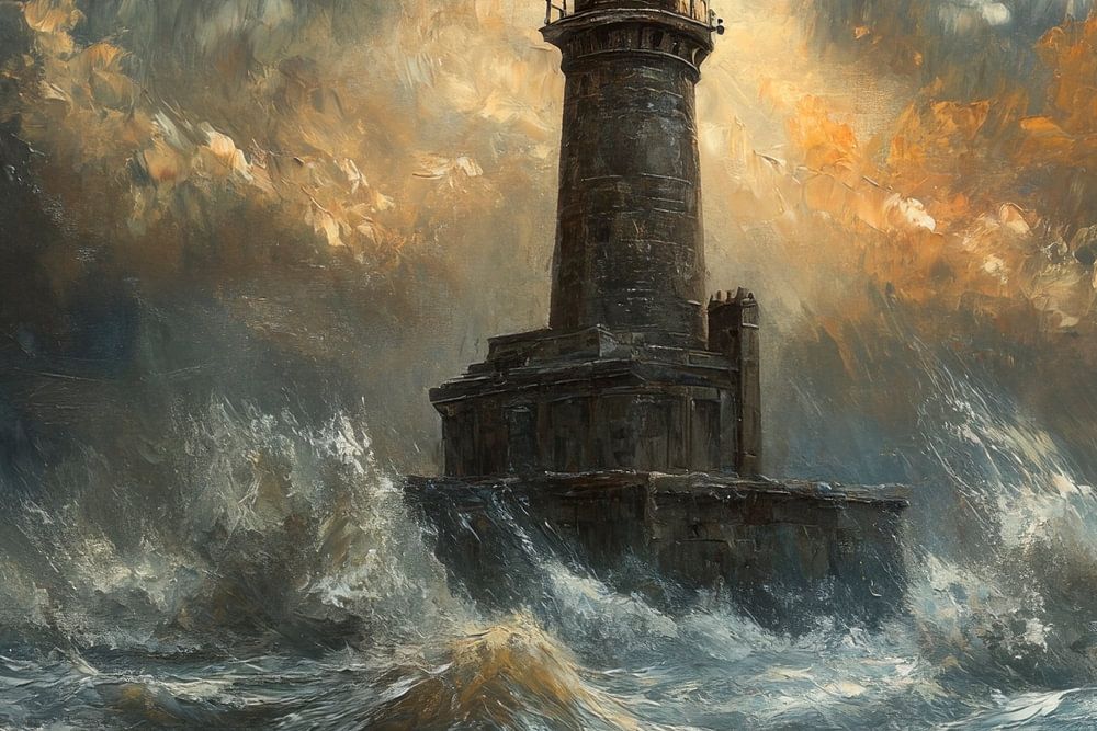 Inmitten wilder Wogen und schäumender Brandung erhebt sich majestätisch ein Leuchtturm, dessen Lichtstrahlen durch die düstere Wolkenquelle brechen. Die dramatische Szenerie entfaltet sich in lebendigen Grautönen, während der Sturm seine unbändige Kraft zeigt. Symbolisch für Hoffnung und Schutz thront der Leuchtturm unerschütterlich in der tobenden See.