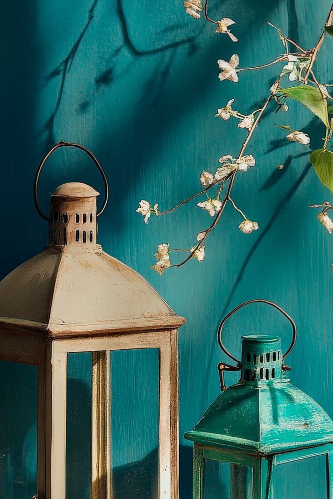 Sanfte Lichtspiele und ein Hauch von Natur verleihen diesem liebevoll arrangierten Duo aus nostalgischen Laternen eine beruhigende Atmosphäre. Der elegante Kontrast zwischen dem zarten Weiß und dem kräftigen Türkis harmoniert perfekt mit dem sanften Blauton der Wand. Ideal für ein Wohnzimmer, wo sie Gemütlichkeit und stilvolle Akzente setzen.