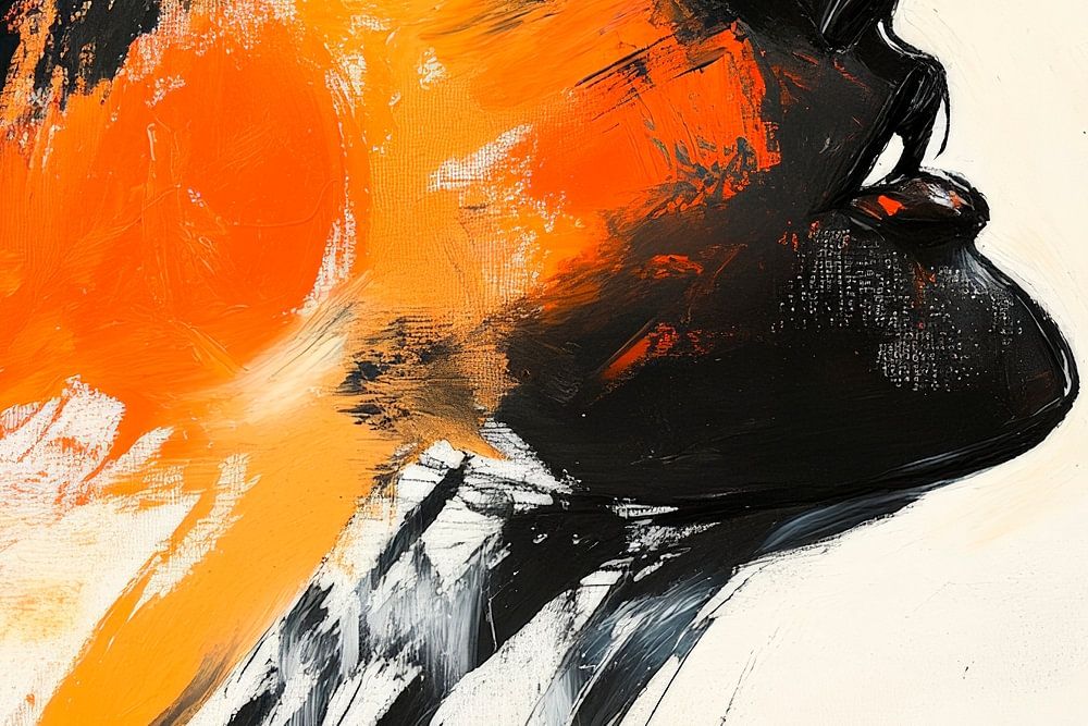 Eine dynamische Silhouette entfaltet sich, während lebendige Orange- und Schwarztöne wild miteinander tanzen. Die kraftvolle Ausdrucksweise durchbricht die Konventionen und erzeugt eine Atmosphäre der Kreativität und Inspiration. Ideal für das Wohnzimmer, schafft dieses Kunstwerk einen eindrucksvollen Gesprächsstoff und zieht die Blicke auf sich.