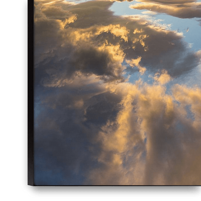 Bestelle das Foto Licht und goldene Wolken am blauen Himmel von Adriana Mueller als Reproduktion auf Leinwand, Alu-Dibond, als Poster, Fototapete oder Acrylglasbild.