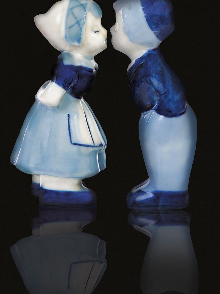 Delfter Blau küssendes Paar, Mann und Frau. Für ein modernes Aussehen auf schwarzem Hintergrund platziert. Es lebe die Liebe und unsere Freiheit!