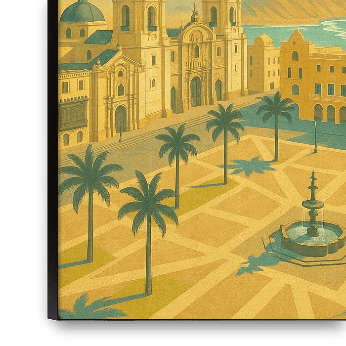 Bestelle dieses Art Deco-Wandbild Lima Golden Horizon - Art Deco Plaza Mayor Poster von Travel Shop als Reproduktion auf Leinwand, Alu-Dibond, als Poster, Fototapete oder Acrylglasbild.