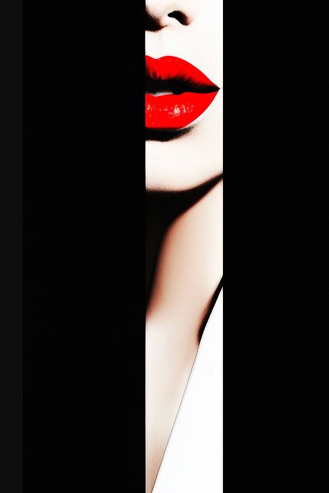 Ein geheimnisvolles Spiel von Licht und Schatten entfaltet sich in dieser eleganten Komposition. Die strahlend roten Lippen ziehen die Blicke an und verleihen dem Kunstwerk eine verführerische Aura. Ideal für das Boudoir oder das Wohnzimmer, schafft es eine faszinierende Atmosphäre und regt die Fantasie an. Perfekt für einen Hauch von Glamour in jedem Raum.