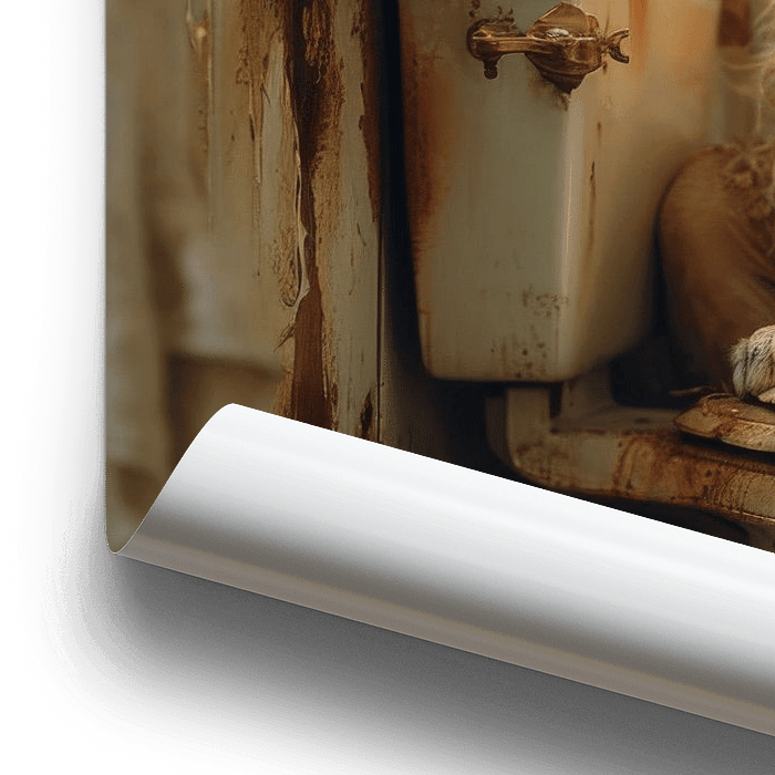 Ein Löwe sitzt entspannt auf einem WC, liest eine Zeitung und erledigt seine Notdurft - perfekt für ein lustiges Toilettenposter.