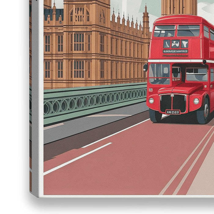 Ein leuchtend roter Doppeldeckerbus überquert die majestätische Brücke, während der ikonische Big Ben im Hintergrund stolz hochragt. Die elegant gezeichneten Gebäude des Westminster-Palastes umrahmen die Szenerie und verleihen dem Bild einen nostalgischen Charme. Wolken ziehen sanft über den Himmel, während London seine zeitlose…