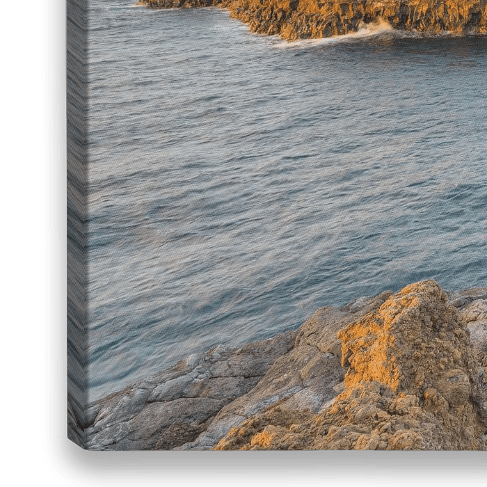 Die Felsen von Los Hervideros wirken in der warmen Abendsonne fast wie glühende Lava, als würde die Insel für einen Moment ihre vulkanische Herkunft offenbaren. Das Licht streift über die zerklüfteten Klippen, hebt jede Kante hervor und lässt das Meer darunter in tiefem Blau schimmern. Die Brandung des ruhigen Meeres läuft sanft in die…
