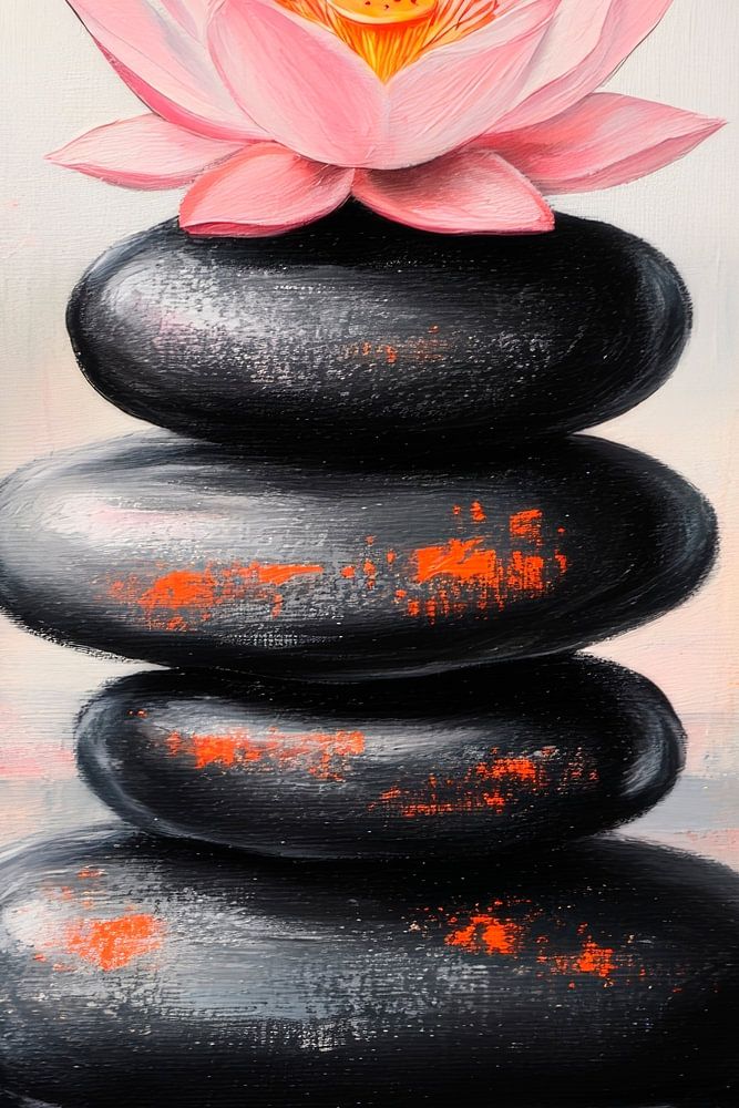 Bestelle diese Malerei Lotusblüte auf Steinen – Ruhe und Harmonie von Poster Art Shop als Reproduktion auf Leinwand, Alu-Dibond, als Poster, Fototapete oder Acrylglasbild.