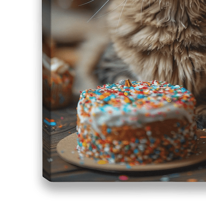 Bestelle das Foto Lustige Katze Feiert Geburtstag mit Partyhut und Torte von Poster Art Shop als Reproduktion auf Leinwand, Alu-Dibond, als Poster, Fototapete oder Acrylglasbild.