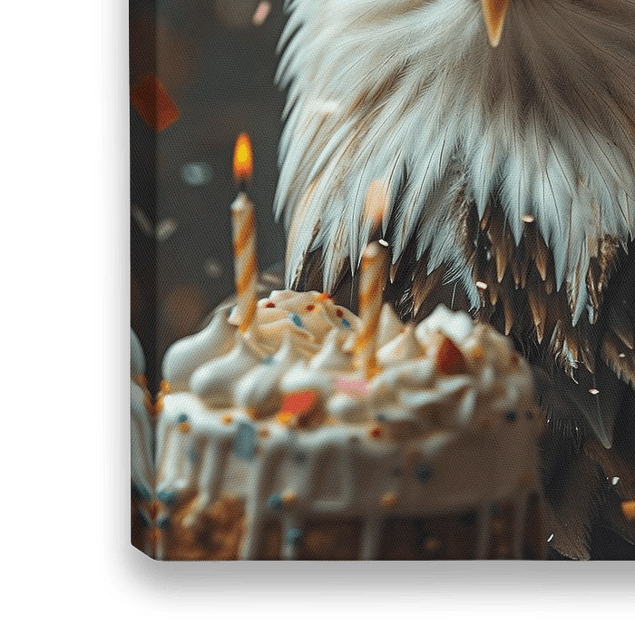 Lustige Darstellung eines Adlers mit Partyhut, umgeben von buntem Konfetti, symbolisiert einen fröhlichen Geburtstag.
