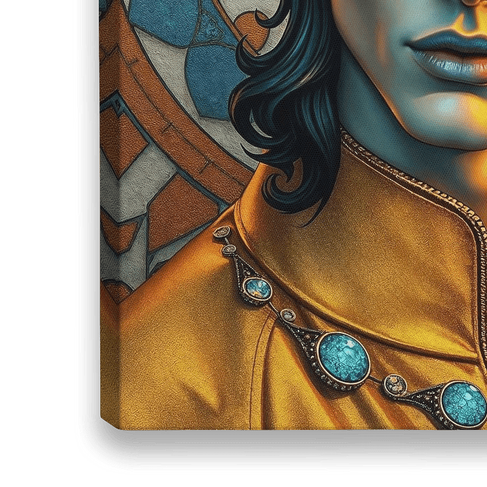Männergemälde nach Klimt. Er trägt goldene Kleidung und ist mit detaillierten runden Formen geschmückt in den Schattierungen von Blau, Gold und Orange. Der Hintergrund ist eine harmonische Mischung aus abstrakten Designs und kreisförmigen Motiven, die die Einflüsse des Jugendstils widerspiegeln.