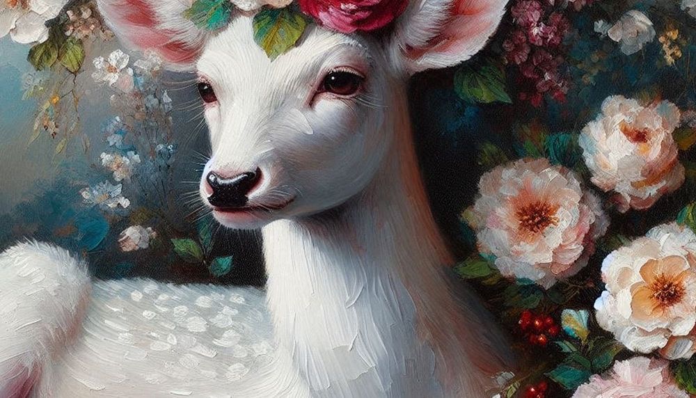 Ein Porträt eines märchenhaften weißen Hirsches, umgeben von einer Natur voller Blumen. Das digitale Kunstwerk ist im Stil eines klassischen Gemäldes gehalten. Eine zauberhafte Ergänzung für Ihr Interieur, die zum Träumen anregt.