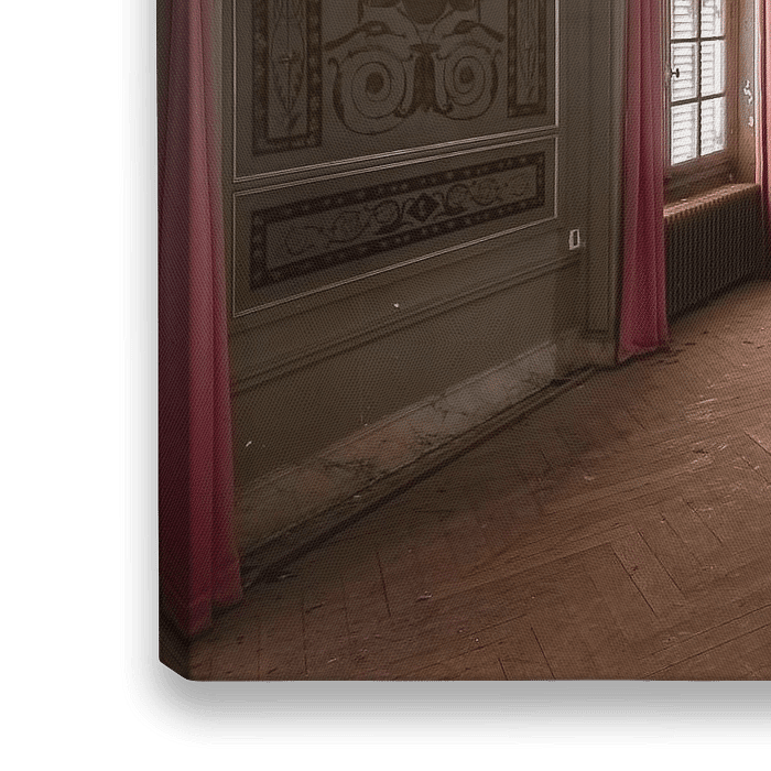 Ein schönes und gemütliches Zimmer in einem verlassenen Schloss in Frankreich. Im Inneren wurden nur wenige oder gar keine Möbel gefunden, aber die schönen Konturen des Gebäudes sind deutlich sichtbar.