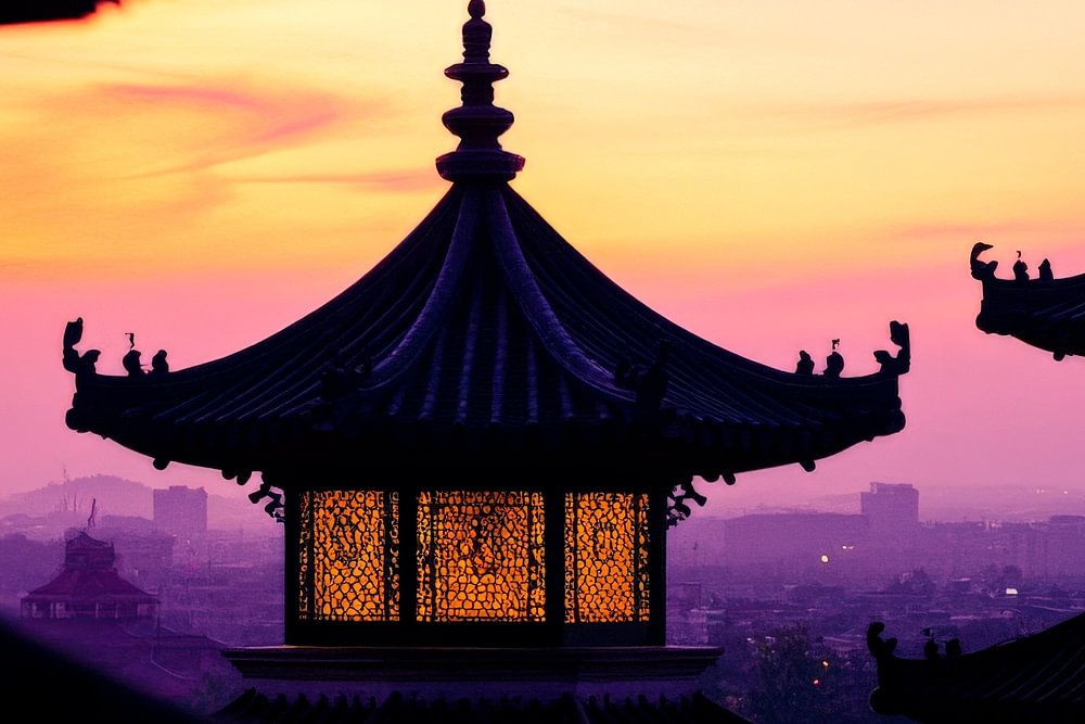 Mit einem zauberhaften Farbenspiel von Lila und Orange strahlen die eleganten Pagodendächer in der Dämmerung eine friedliche Atmosphäre aus. Die sanften Linien und leuchtenden Fenster laden zum Träumen ein und machen dieses Kunstwerk perfekt für das Schlafzimmer, wo es nächtliche Ruhe und Inspiration schenkt.
