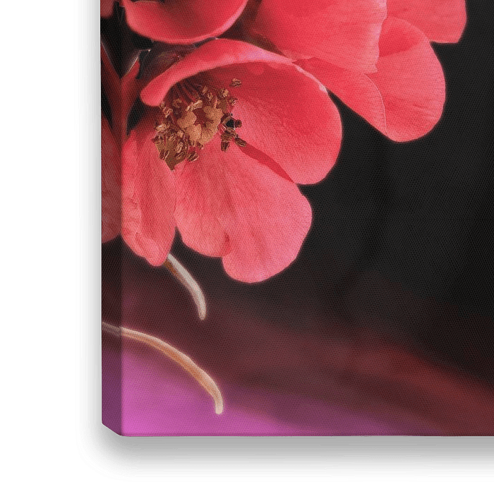 Drei rosa Blüten an einem Zweig vor einem diffusem farblich gestalteten Hintergrund.