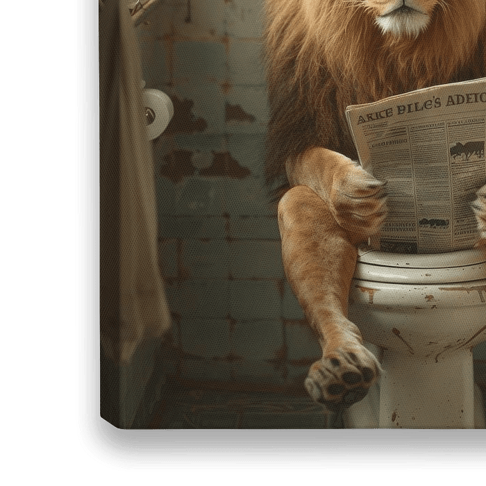 Ein majestätischer Löwe sitzt auf einer Toilette und liest entspannt die Zeitung in einem Retro-Badezimmer.