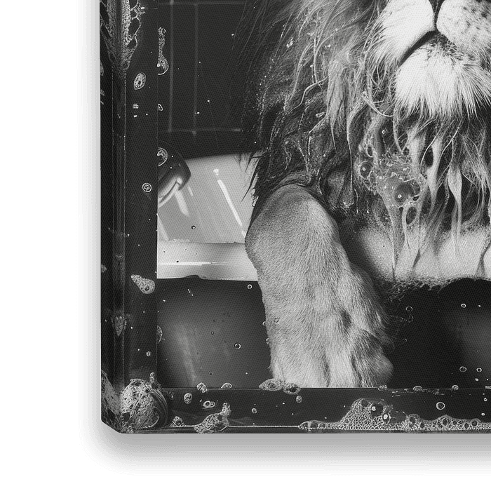 Dieses imposante Badezimmerkunstwerk zeigt einen majestätischen Löwen, der ruhig in seiner Badewanne ruht und Ihrem WC eine beeindruckende Atmosphäre verleiht. Die Schwarz-Weiß-Fotografie fängt die erhabene Präsenz des Löwen ein und betont die Details der Szene, wodurch es eine faszinierende und einzigartige Ergänzung für Ihre Badezimmereinrichtung darstellt. Perfekt geeignet, um Ihr WC oder Badezimmer zu verschönern - es erinnert daran, dass selbst die Könige der Savanne Momente der Ruhe und Entspannung genießen können. Diese moderne Badezimmerbilderserie bietet eine stilvolle Dekoration, die nicht nur zum Staunen anregt, sondern auch Ihrem Badezimmer eine kraftvolle und majestätische Note verleiht. Bringen Sie mit diesem imposanten Kunstwerk eine Atmosphäre von Stärke und Erhabenheit in Ihr WC und lassen Sie sich von seiner Pracht inspirieren.