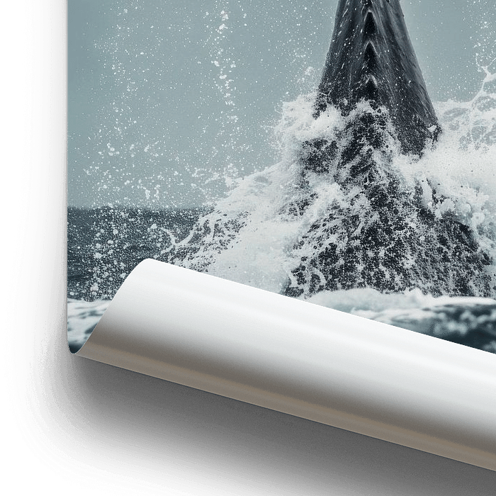 Das Bild zeigt den majestätischen Schwanz eines Wals, der kraftvoll aus dem Wasser auftaucht. Wasserstrahlen spritzen in einem beeindruckenden Bogen, während die dramatische, graue Himmelskulisse die Szene umrahmt. Die Harmonie von Meer und Tier verdeutlicht die Eleganz und Stärke dieses faszinierenden Meeresbewohners.
