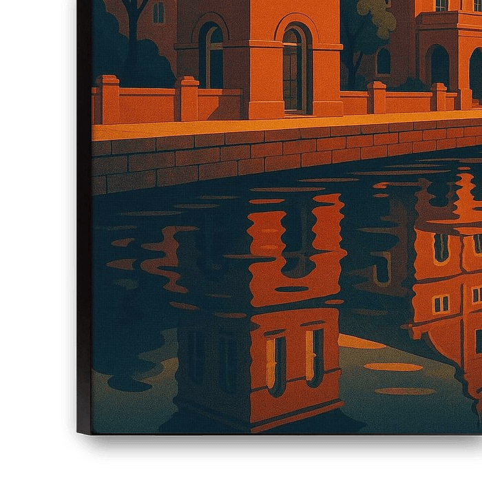 Versetzen Sie sich mit diesem stimmungsvollen Vintage-Poster von Malakka (Melaka) in das historische Herz von Malaysia. Das Kunstwerk zeigt die ikonischen karminroten Gebäude des Dutch Square, insbesondere das Stadthuys und den Uhrenturm, die in einem warmen, bernsteinfarbenen Sonnenuntergang leuchten. Umrahmt wird die Szene vom ruhigen…