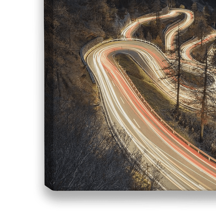 Abends beim Malojapass in der Schweiz. 148 Sekunden dauerte es in etwa, bis ein Auto die Strecke, die im Bildausschnitt zu sehen ist, den Berg hoch geschafft hat. Durch die lange Belichtungszeit erhellen die Lichter der Autos den kompletten Streckenabschnitt. Die graubündener Passstraße verbindet das Oberengadin mit dem Bergell und überwindet dabei den Alpenhauptkamm. Sie ist insgesamt 23 km lang und überwindet dabei 1.100 Höhenmeter.