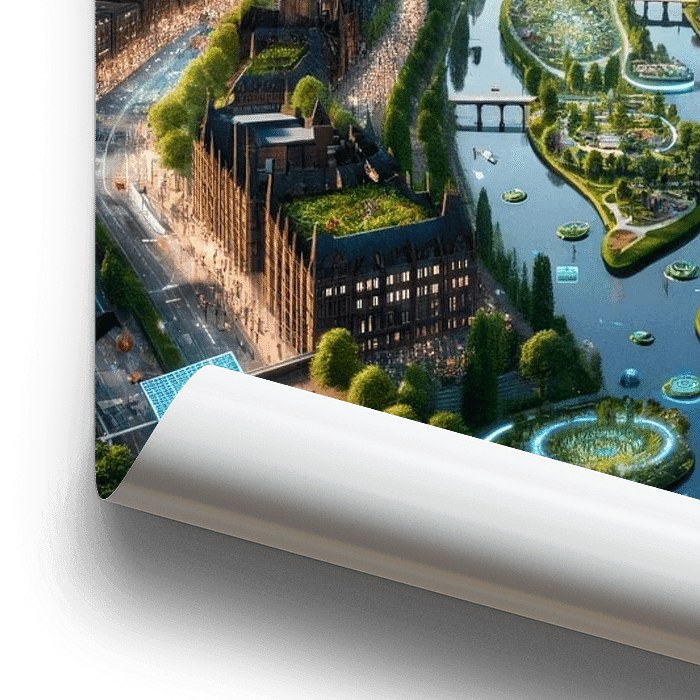 Dieses Poster vereint die Faszination einer futuristischen Stadt mit einer beeindruckenden Verbindung von Natur und urbanem Design. Es zeigt eine imaginative Darstellung der Stadt Manchester, wie sie in einer nachhaltigen Zukunft aussehen könnte. Hohe, elegante Gebäude mit…