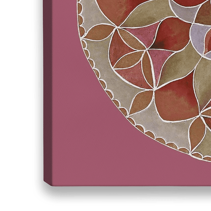 Handgemaltes Mandala, liebevoll coloriert mit Aquarellfarben. Zarte Rosatöne in verschiedenen Nuancen bis zum dunklen Bordauxrot wechseln mit harmonischem dezenten Grün und Grau ab. Das Mandala symbolisiert die Liebe zur Natur durch die zentrale Blume in der Mitte.