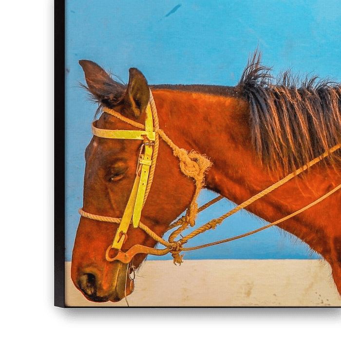 Mann mit Hut und rotem Hemd sitzt auf einem mageren Pferd vor einem hellblauen Hintergrund in Havanna, Kuba