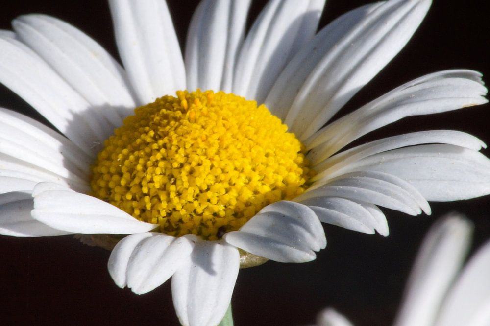 Edel sieht die weiße Margarite vor dem schwarzen Hinergrund aus.