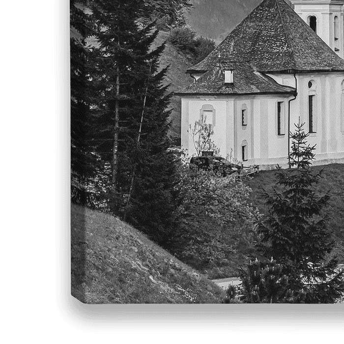 Eine 16:9 Schwarz-Weiß-Fotografie der berühmten Wallfahrtskirche Maria Gern in der Nähe der Stadt Berchtesgaden mit Blick auf den Watzmann im Berchtesgaderner Land, im deutschen Bundesland Bayern, Süddeutschland.