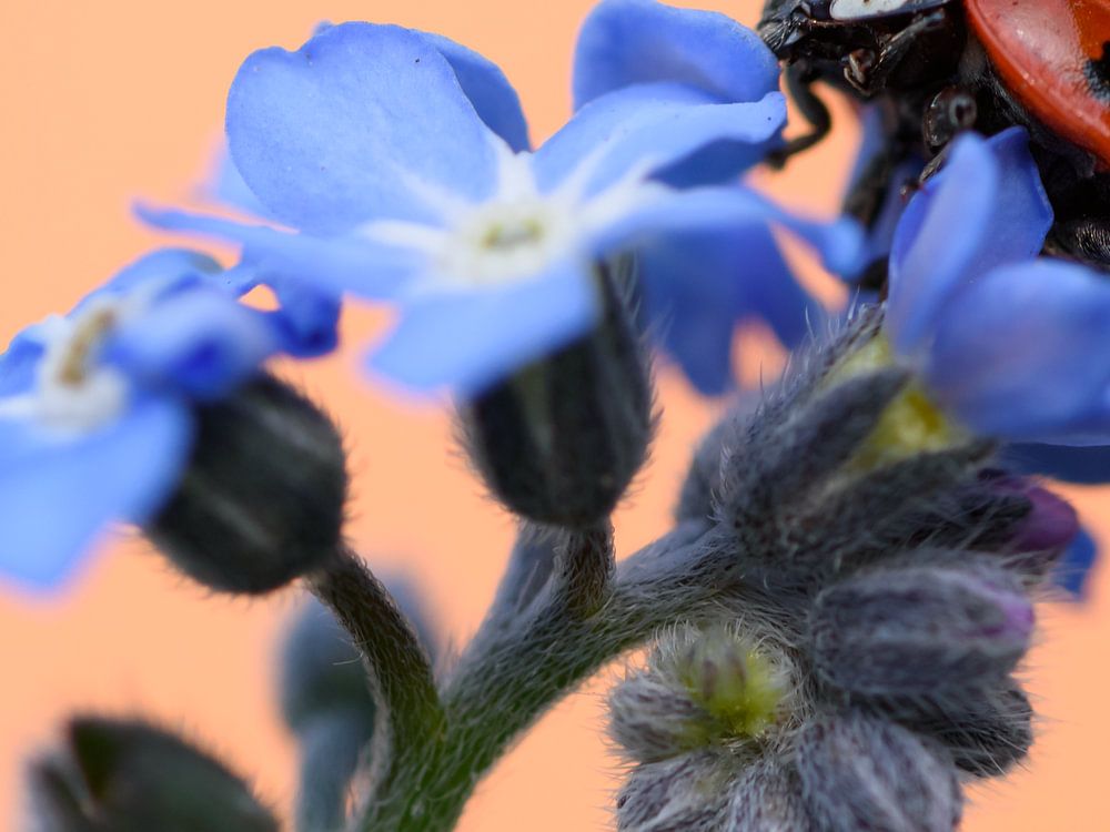 Makroaufnahme eines Marienkäfers auf einem Vergissmeinnicht.