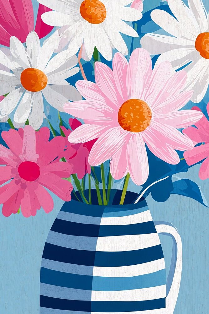 Eine fröhliche Illustration einer gestreiften marineblau-weißen Vase, gefüllt mit einem üppigen Strauß weißer und rosa Gänseblümchen. Die Vase steht auf einem verspielten rosa Hintergrund mit weißen Punkten vor einem ruhigen hellblauen Hintergrund. Die Komposition strahlt eine frische, moderne und verspielte Atmosphäre mit einer perfekten Balance aus nautischen und floralen Elementen aus.