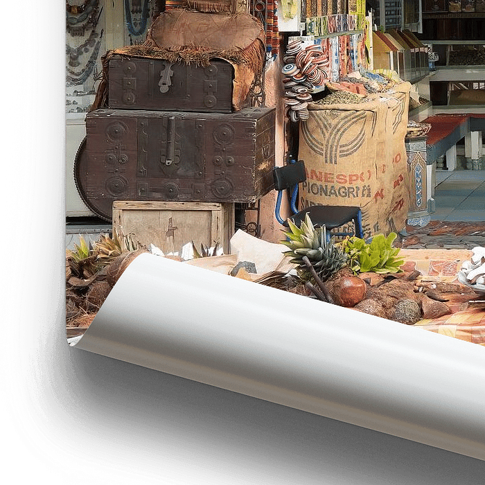 Das Wandbild fängt die lebendige Atmosphäre eines orientalischen Marktes ein, ohne überladen zu wirken. Die Komposition lenkt den Blick auf Details und Farbflächen, die dem Raum Wärme und Charakter verleihen.