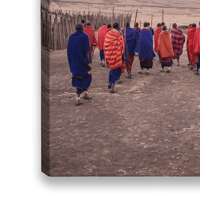 Massai mit authentischer Kleidung und Outfit auf den trockenen Ebenen Tansanias an einem bewölkten Morgen. Kleidung in den schönen Farben Blau, Rot und Orange.