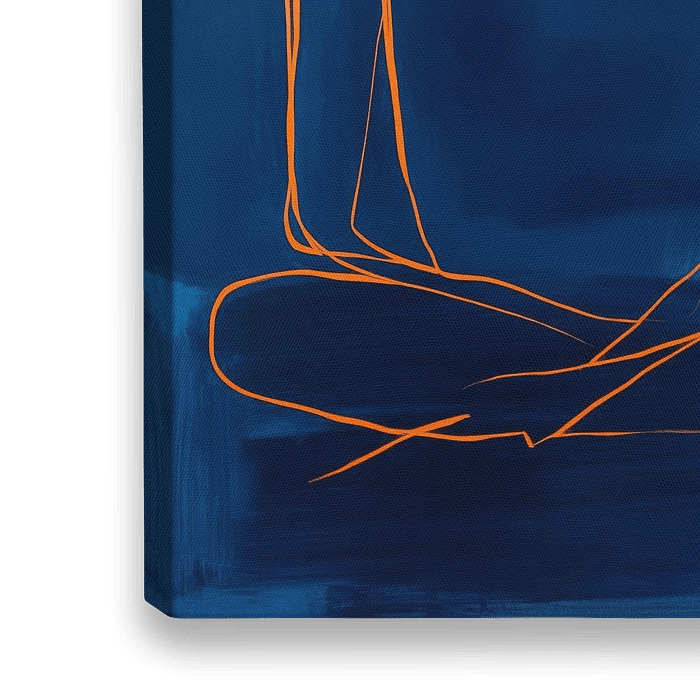 In tiefen Blautönen entfaltet sich eine minimalistische Silhouette, die Ruhe und Gelassenheit ausstrahlt. Die lebendigen, orangefarbenen Linien schaffen einen faszinierenden Kontrast und verleihen dem Bild Dynamik. Ideal für das Schlafzimmer oder einen Meditationsraum, lädt es dazu ein, in die eigene Stille einzutauchen und Inspiration zu finden.