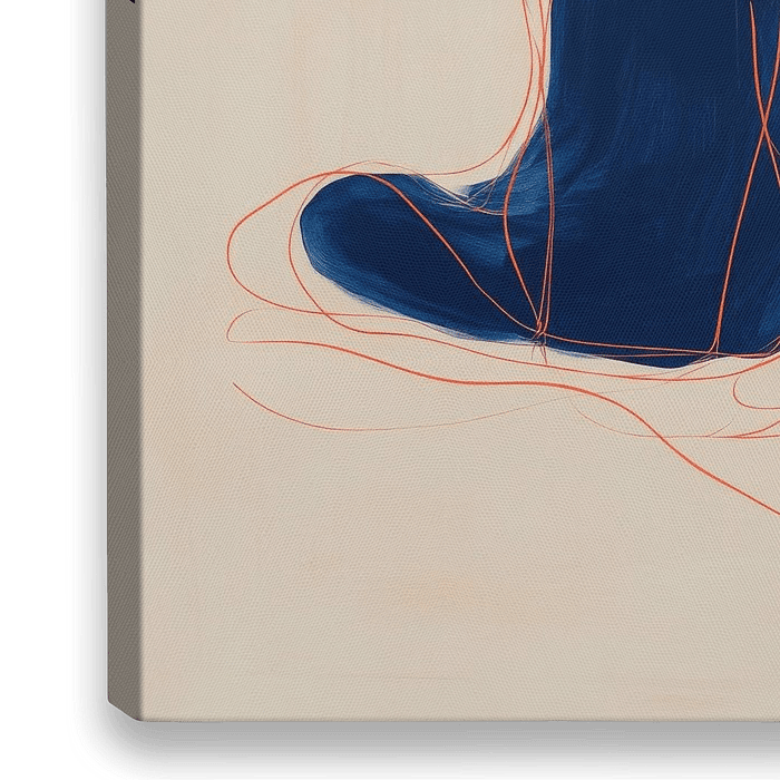 Ein beeindruckendes Spiel aus tiefem Blau und sanften roten Linien entfaltet eine meditative Ruhe. Die abstrahierte Silhouette, die in stiller Reflexion verweilt, strahlt Gelassenheit aus und zieht den Blick an. Perfekt für ein Schlafzimmer oder einen ruhigen Rückzugsort, wo Harmonie und innere Balance gefeiert werden.