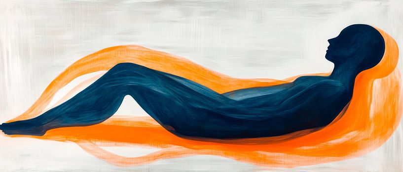 Ein faszinierendes Spiel aus Formen und Farben entfaltet sich hier: Eine silhouette liegt entspannt in harmonischem Zusammenspiel mit sanften, orangefarbenen Wellen. Die kontrastierenden Töne vermitteln ein Gefühl von Ruhe und Gelassenheit. Dieses Kunstwerk könnte perfekt im Schlafzimmer zur Förderung von Entspannung und Wohlbefinden…