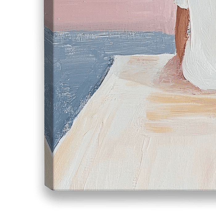 Seascape | Pink Horizon - Dieses Frauengemälde zeigt eine heitere Frau in weißer Kleidung und Hut, die von hinten gesehen auf ein ruhiges Meer unter einem weiten rosa Himmel blickt.