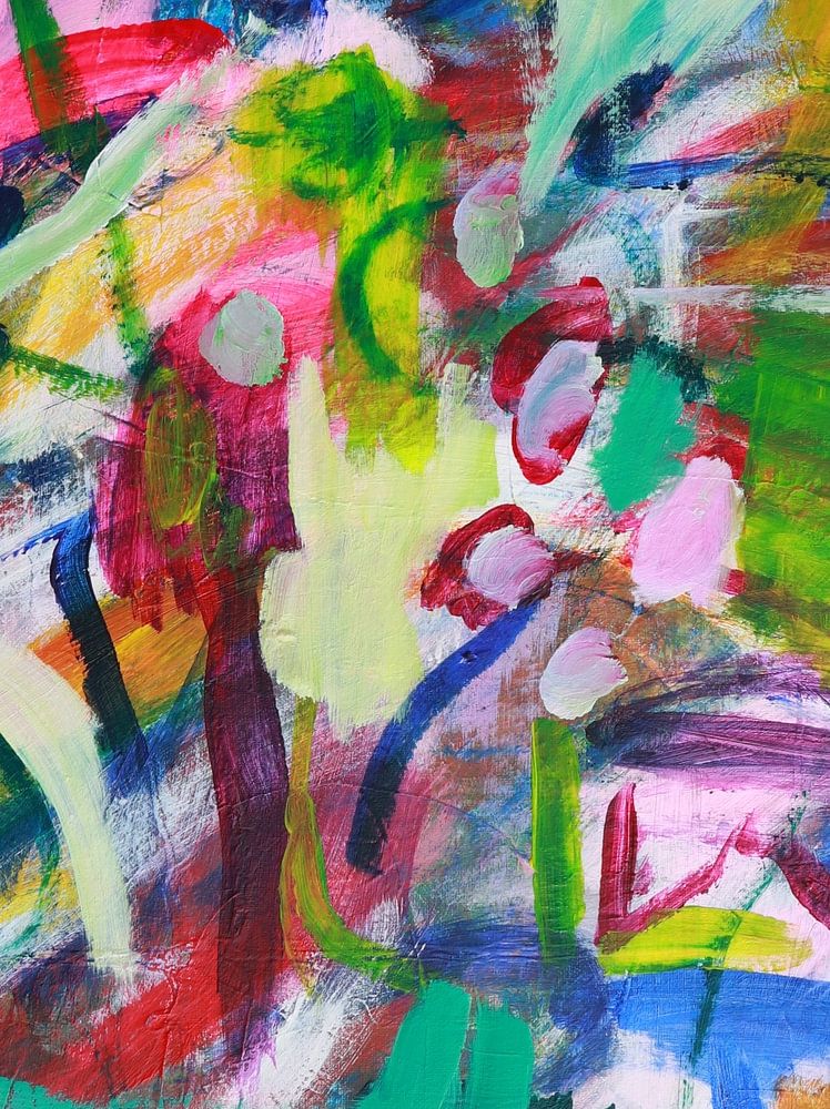 Entdecken Sie immer wieder etwas Neues in diesem mehrfarbigen Gemälde. Verspielte, anregende und fantasievolle abstrakte Malerei.