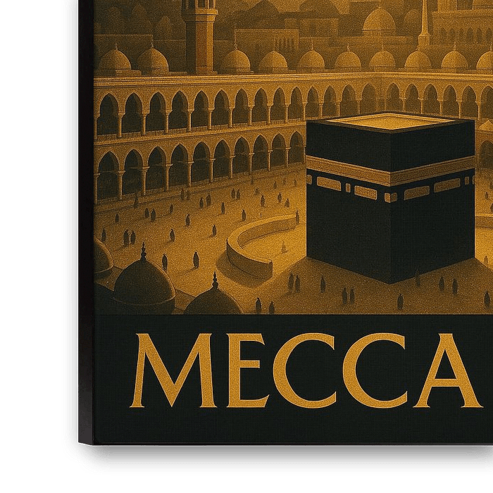Bestelle dieses Landschafts-Wandbild Mekka Vintage Travel Poster - Die Kaaba & Royal Clock Tower Kunst von Travel Shop als Reproduktion auf Leinwand, Alu-Dibond, als Poster, Fototapete oder Acrylglasbild.