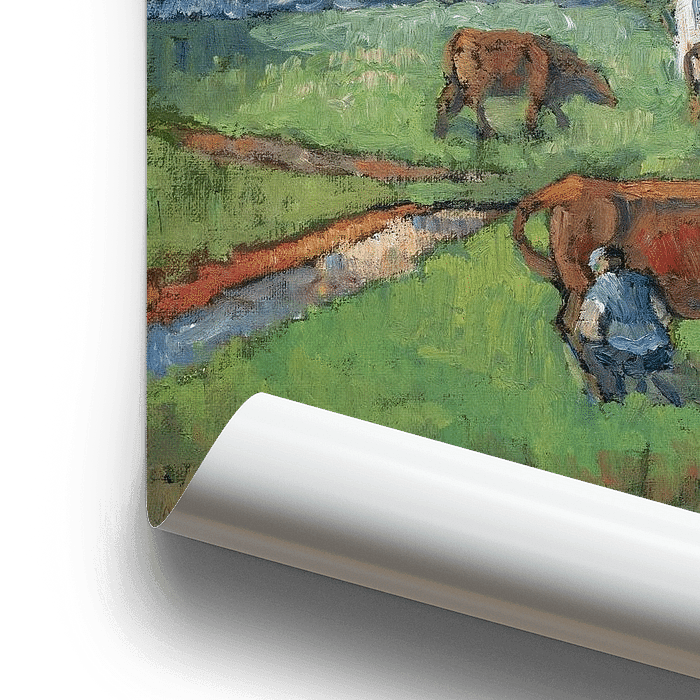 Diese Landschaft wurde wahrscheinlich in den späten 1960er Jahren in der Nähe von Lebbeke gemalt. Im Vordergrund ist ein Bauer beim Melken einer Kuh zu sehen. Unten rechts im Bild sind mehrere Milchkannen und eine klassische Schubkarre zu sehen. Die Kirche im Hintergrund ist wahrscheinlich die Sint-Martinus-Kirche von Denderbelle. Dieses kleine Dorf liegt zwischen Lebbeke in Ostflandern, wo der Maler lebte, und Dendermonde in Belgien.