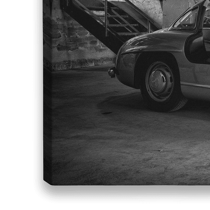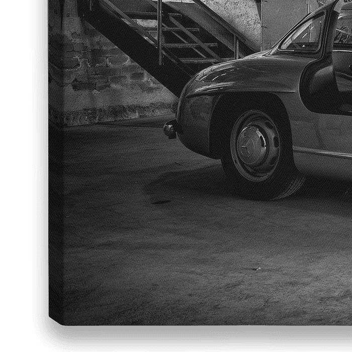 Mercedes Benz W198, Verkaufsbezeichnung Mercedes SL 300 Coupé. Von diesem legendären Automobil wurden nur 1400 Stück gebaut, dementsprechend begehrt und teuer ist dieser Sportwagen. Fotografiert in schwarzweiß.