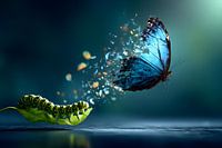 Eine Raupe sitzt auf einem Blatt, während sich vor ihr ein blauer Schmetterling formt – sein Flügel scheint aus leuchtenden Partikeln zu entstehen oder zu zerfallen. Die Szene wirkt wie ein eingefrorener Moment der Metamorphose. Der Kontrast zwischen dem bodennahen Anfang und der schwebenden Leichtigkeit erzeugt eine starke visuelle…
