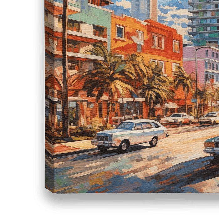 Dieses Miami Beach Downtown Gemälde erweckt die pulsierende Atmosphäre von Miami in einem stilvollen und künstlerischen Bild zum Leben. Das Bild zeigt einen farbenfrohen Eindruck der Innenstadt von Miami Beach, wo moderne Architektur, Palmen und tropisches Stadtleben aufeinandertreffen. Das Werk fängt die Essenz von Sonnenschein,…