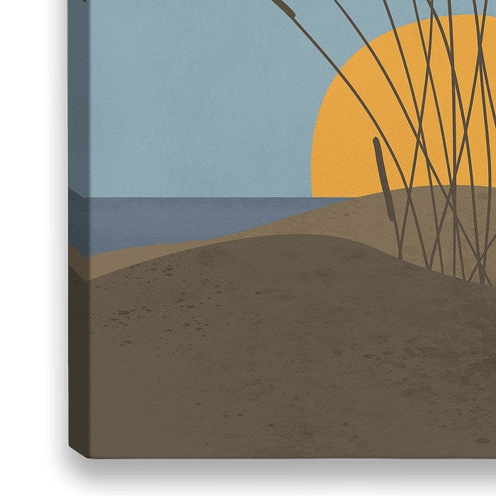 Bestelle das digitale Kunst Bild Minimalistische Illustration von Dünen und einer orangefarbenen Sonne von Tanja Udelhofen als Reproduktion auf Leinwand, Alu-Dibond, als Poster, Fototapete oder Acrylglasbild.