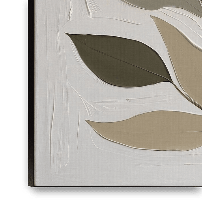 Dieses moderne Kunstwerk vermittelt ein Gefühl von Ruhe und Einfachheit. Es zeigt einen Zweig mit Blättern in sanften Erdtönen wie Olivgrün und Beige vor einem dezent strukturierten Hintergrund. Das minimalistische Design macht dieses Kunstwerk perfekt für ein modernes Interieur, in dem Ruhe und Gelassenheit wichtig sind. Die sanften…