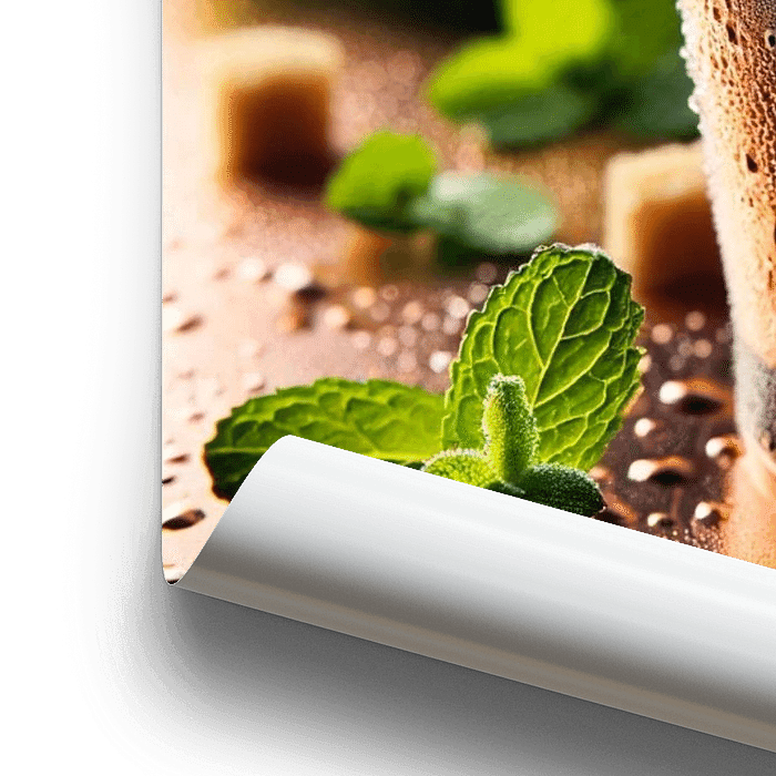 Das Bild "Mint Julep" fängt mit atemberaubender Klarheit den Geist dieses klassischen Cocktails ein. Das Glas, bedeckt mit einer lebendigen Kondensation, zelebriert das erfrischende Wesen des Getränks, während die glitzernden Tropfen auf der Oberfläche den visuellen Eindruck von Frische verstärken. Der Cocktail selbst, strahlend durch…