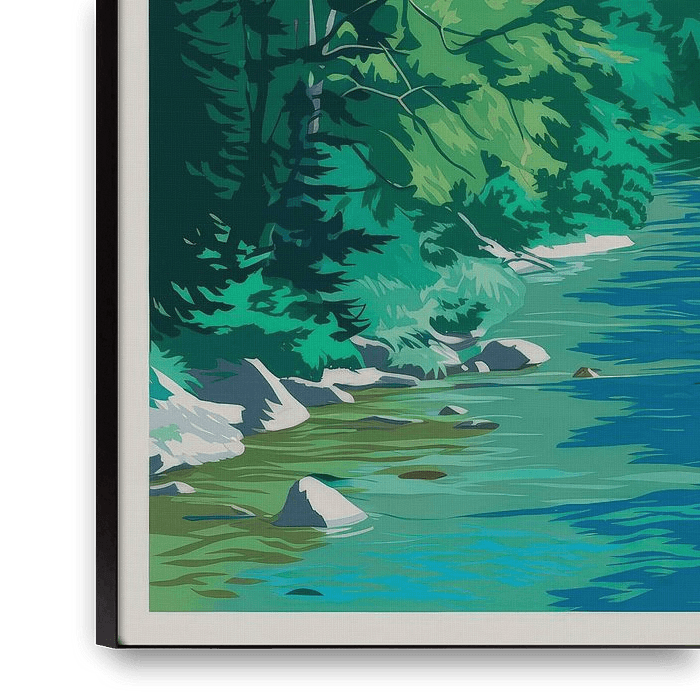 Ein harmonisches Zusammenspiel aus sanften Blau- und Grüntönen entfaltet sich in dieser idyllischen Naturdarstellung, die den ruhigen Flusslauf der Ozark National Scenic Riverways einfängt. Die friedliche Szenerie mit üppigem Grün und strahlendem Himmel lädt zur Entspannung ein und bringt frische, beruhigende Energie in jedes Wohnzimmer.
