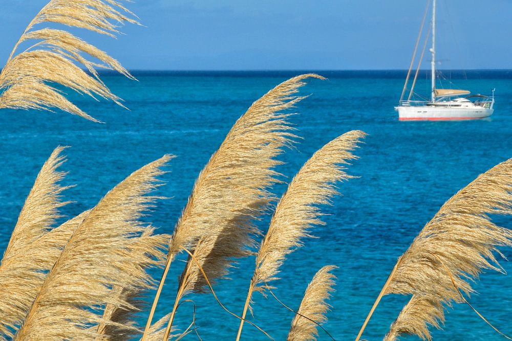Segelboot am Strand von La Pelosa. Karibische Verhältnisse im Mittelmeer, einer der Lieblingsorte der Italiener auf Sardinien