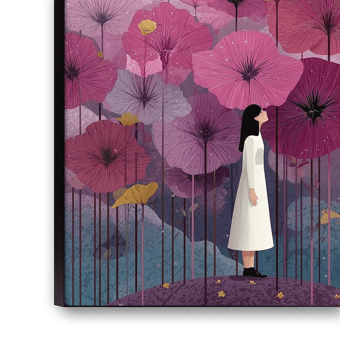 Eine Illustration, die eine traumhafte Nachtszene mit riesigen, rosafarbenen Mohnblumen vor einem Sternenhimmel zum Leben erweckt. Eine Frau in einem weißen Kleid steht gelassen zwischen den Blumen, begleitet von einer schwarzen Katze. Die Komposition strahlt Ruhe und Staunen aus, dezente Goldakzente unterstreichen die magische Atmosphäre.