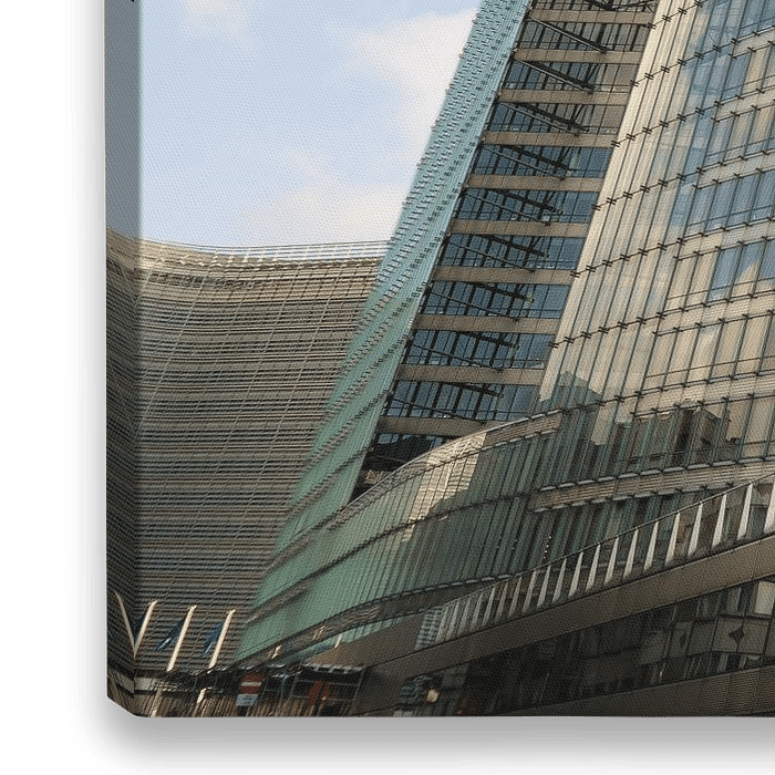 Das Abendlicht wird in den Panels dieses modernen Gebäudes im modernen EU-Viertel in Brüssel, Belgien, reflektiert.