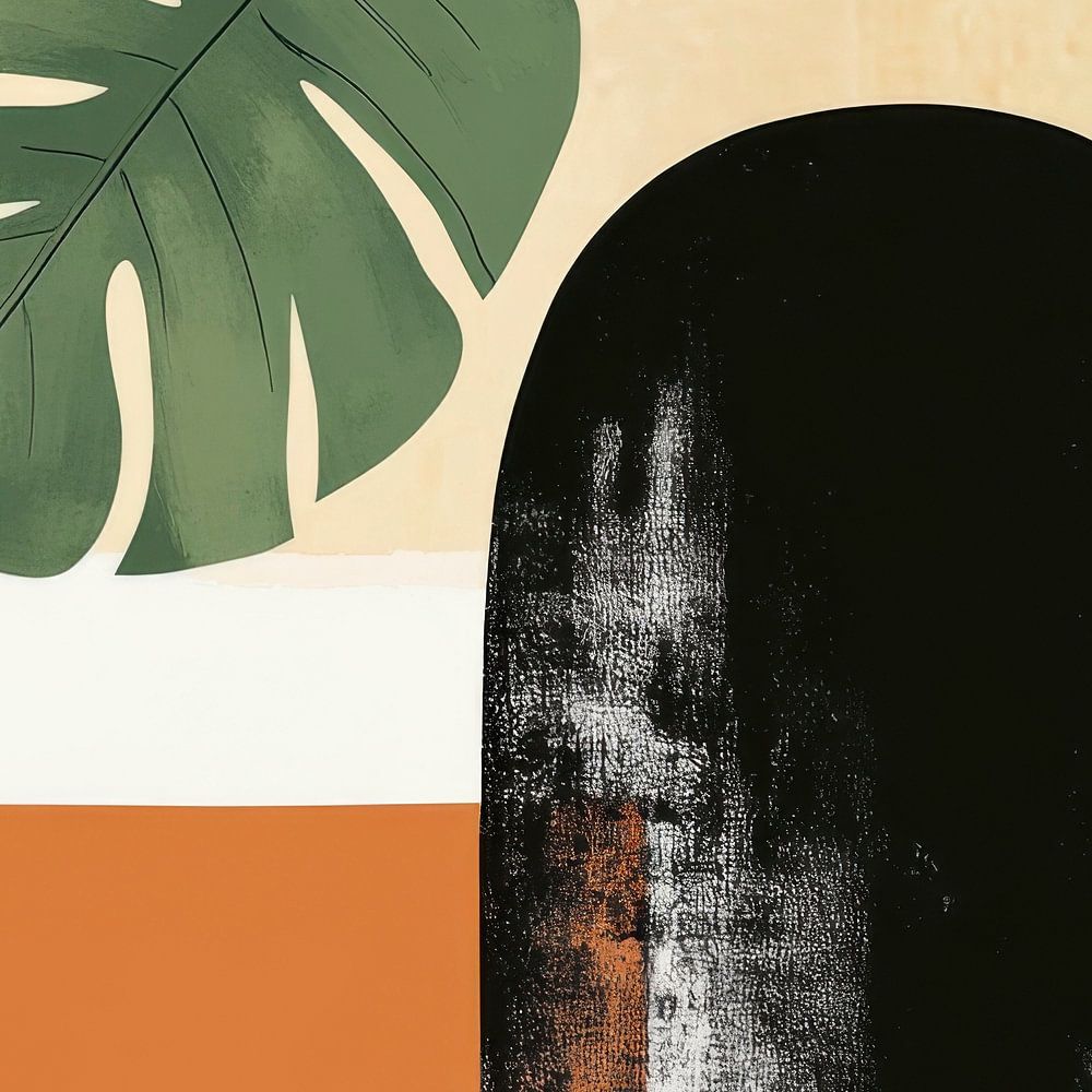 Ein harmonisches Spiel aus Form und Farbe entfaltet sich: Eine üppige Monstera-Entblätterung kontrastiert mit einem glänzenden, schwarzen Bogen, während warme Erdtöne und sanfte Pastellflächen eine einladende Atmosphäre schaffen. Die Komposition strahlt modern und gleichzeitig natürlichen Flair aus, ideal für kreative Inspiration und entspannende Räume.